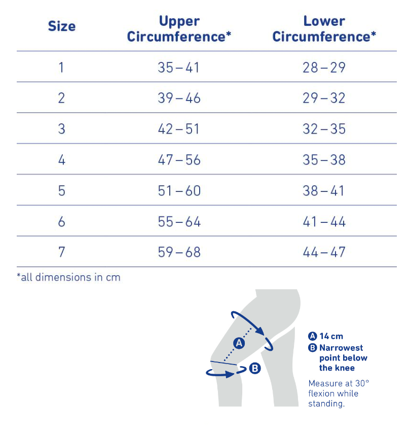 Measure the Upper Circumference 14cm above the knee; Measure the Lower Circumference at the narrowest point below the knee.
