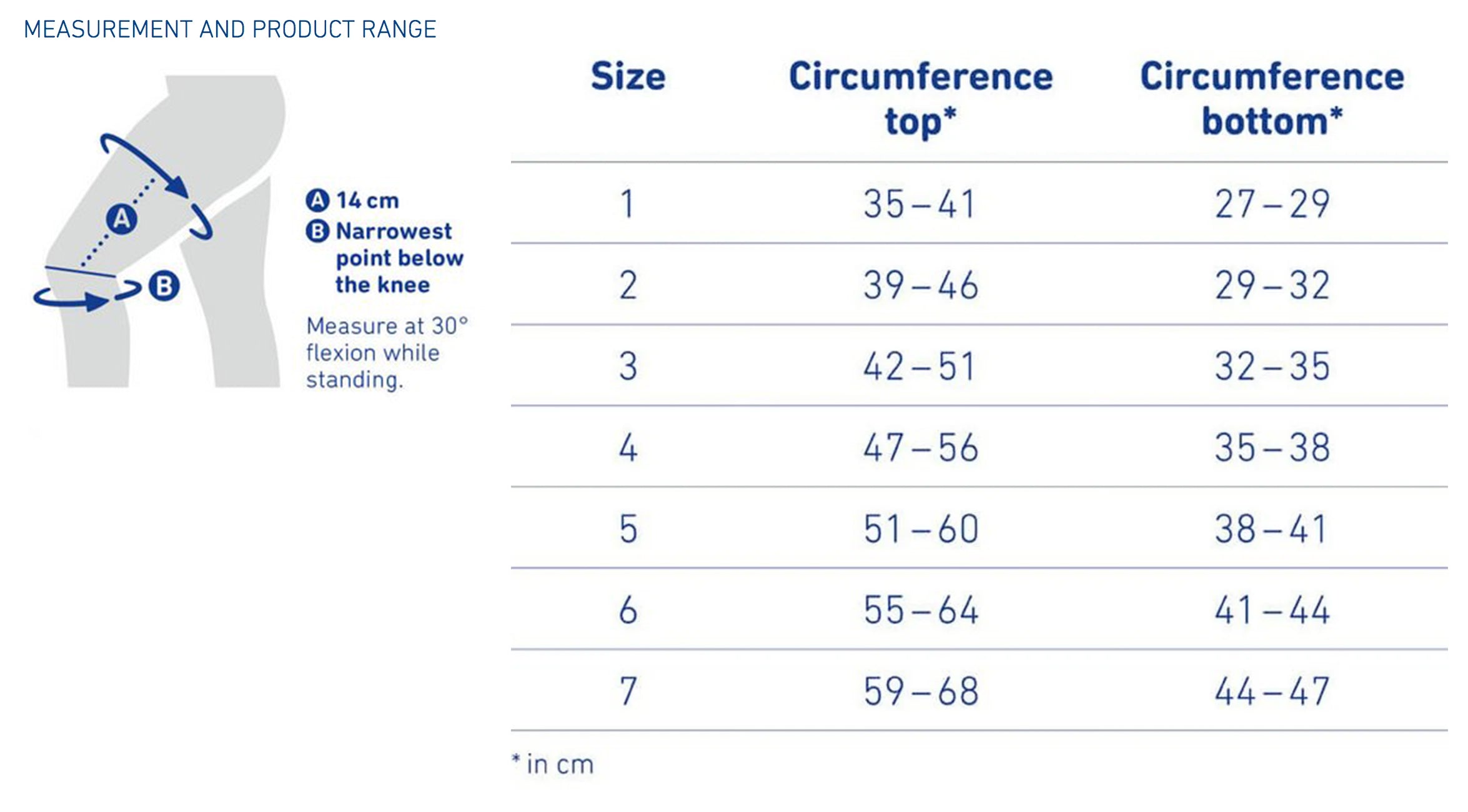 Measure the Upper Circumference 14cm above the knee and then the Lower Circumference at the narrowest point below the knee.