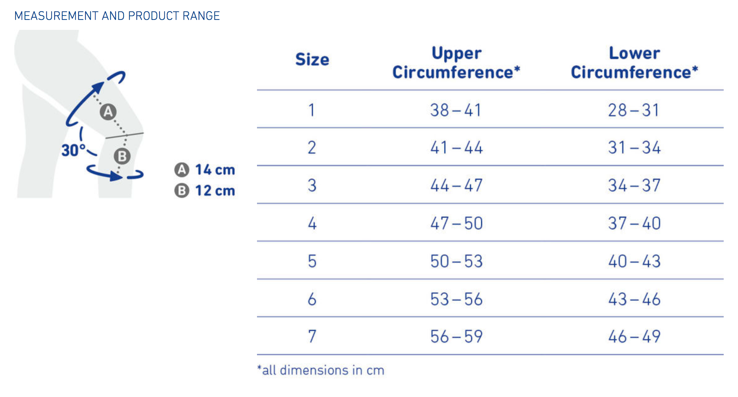 Measure the Upper Circumference 14cm above the knee; Measure the Lower Circumference 12cm below the knee.