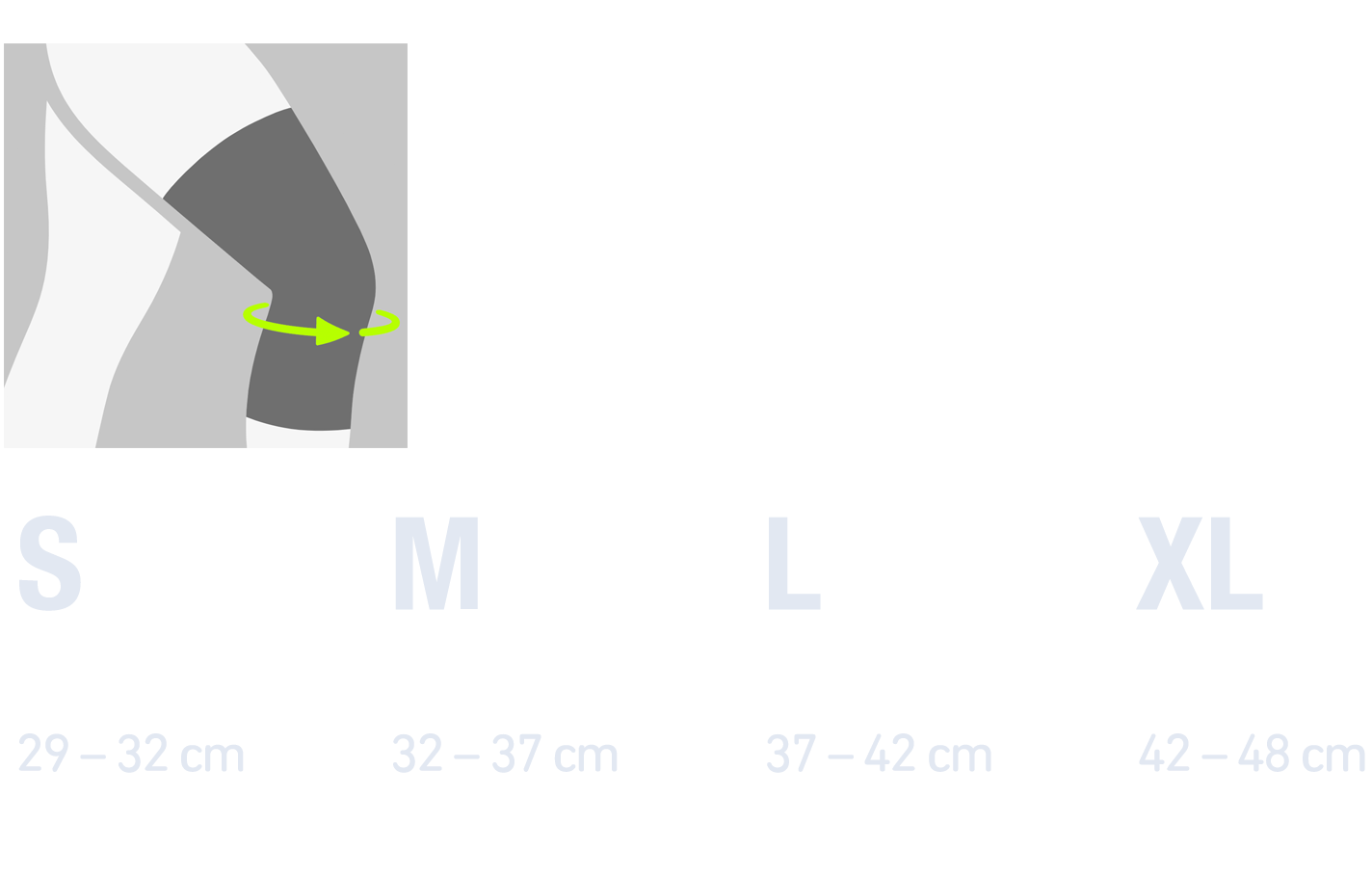 Den korrekta storleken på Sports Compression Knee Sleeve väljs med hjälp av omkretsen precis under knäskålen. Knästödet är tillverkat i Tyskland enligt högsta kvalitetsstandard.