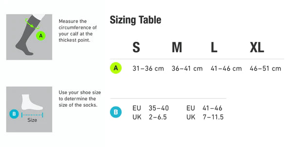 Sportstrumpor är gjorda av ultratunn mikrofiber och känns lätta och bekväma på huden. Tack vare sin räfflade struktur är de särskilt bekväma att bära och ta på. Utskärningen vid akillessenan skyddar mot tryck och skav. De knähöga sockorna kan tvättas i 40 °C. För att säkerställa att rätt storlek väljs, mät omkretsen på den bredaste delen av vaden och skostorleken.